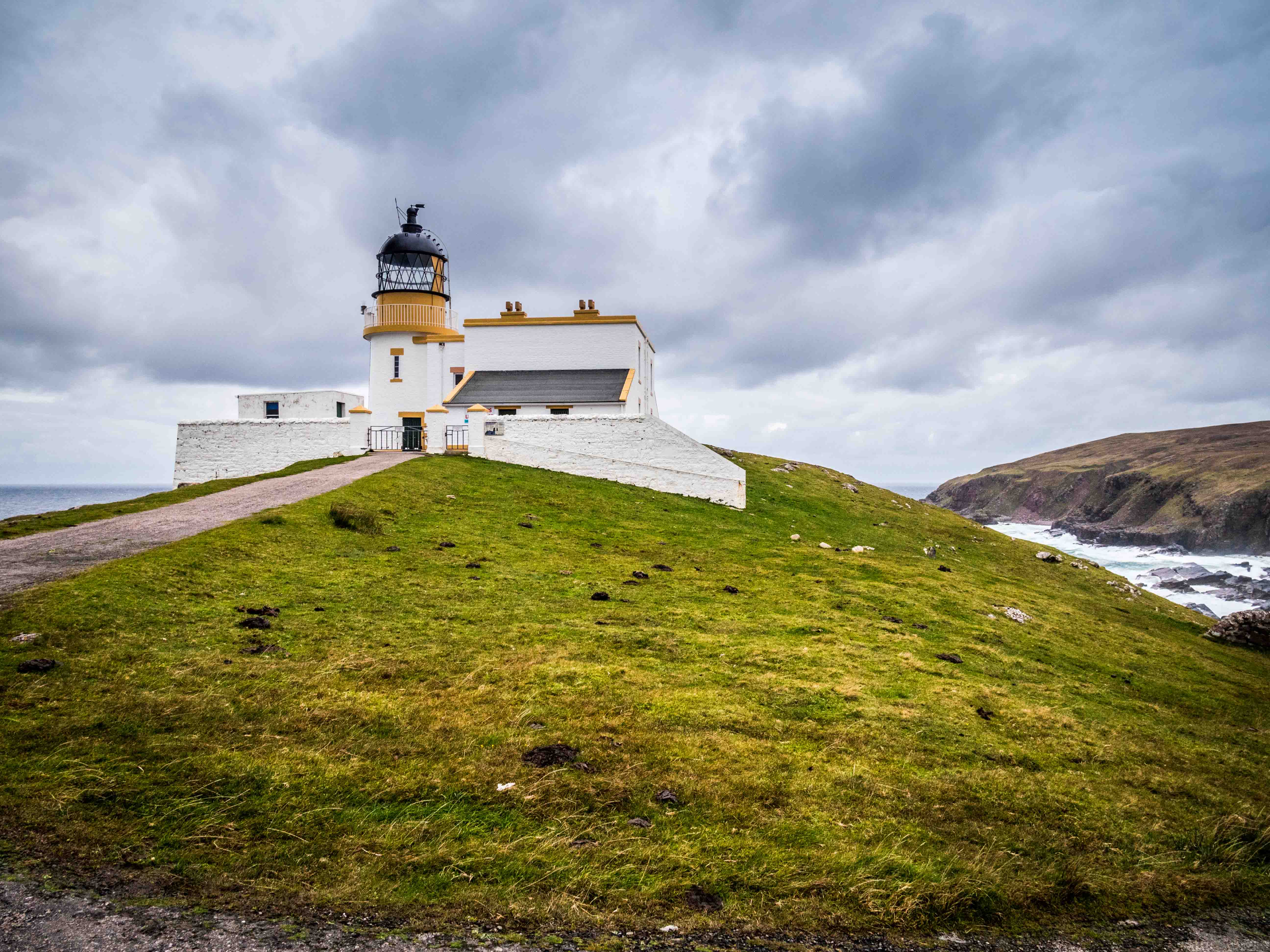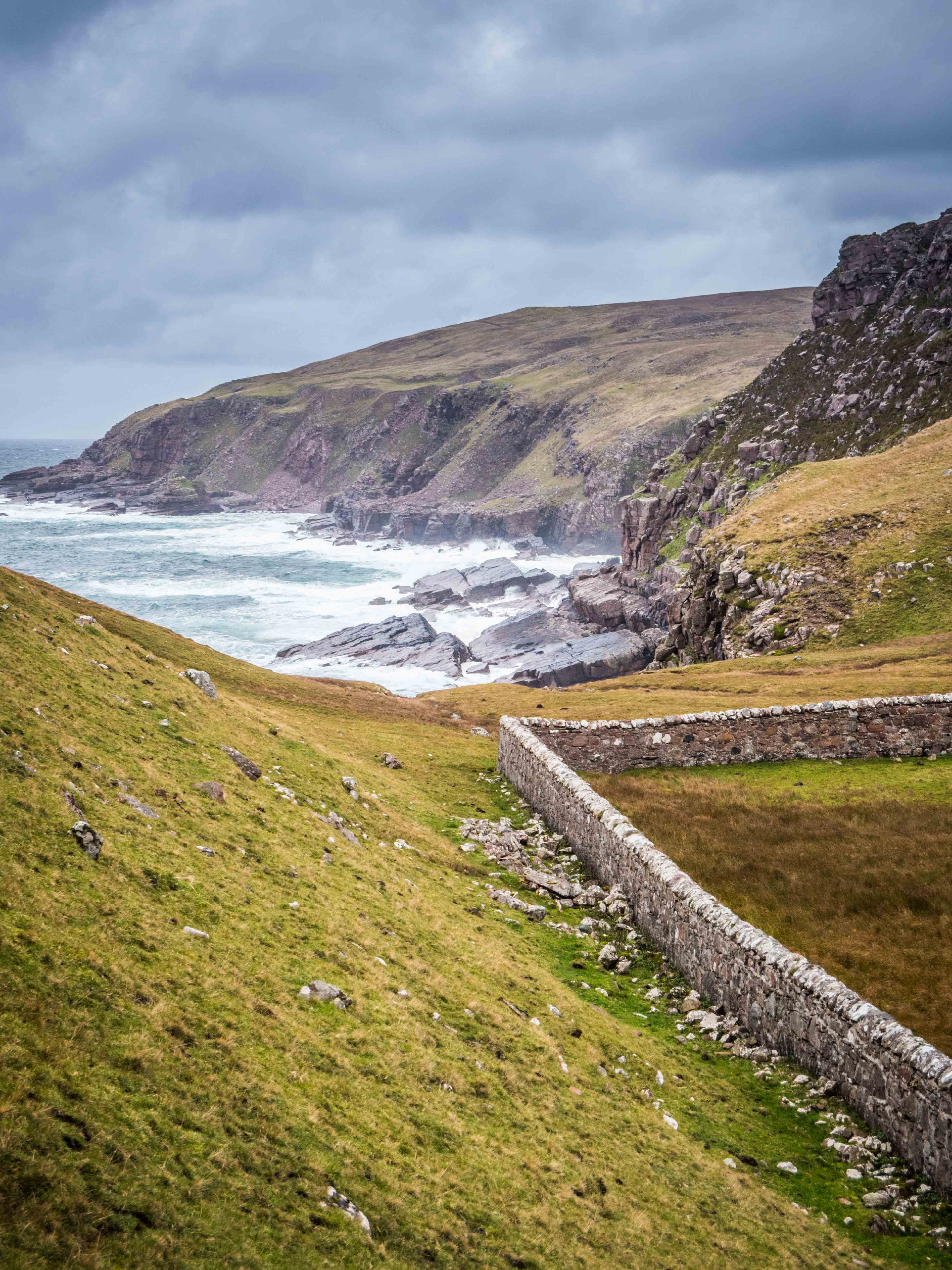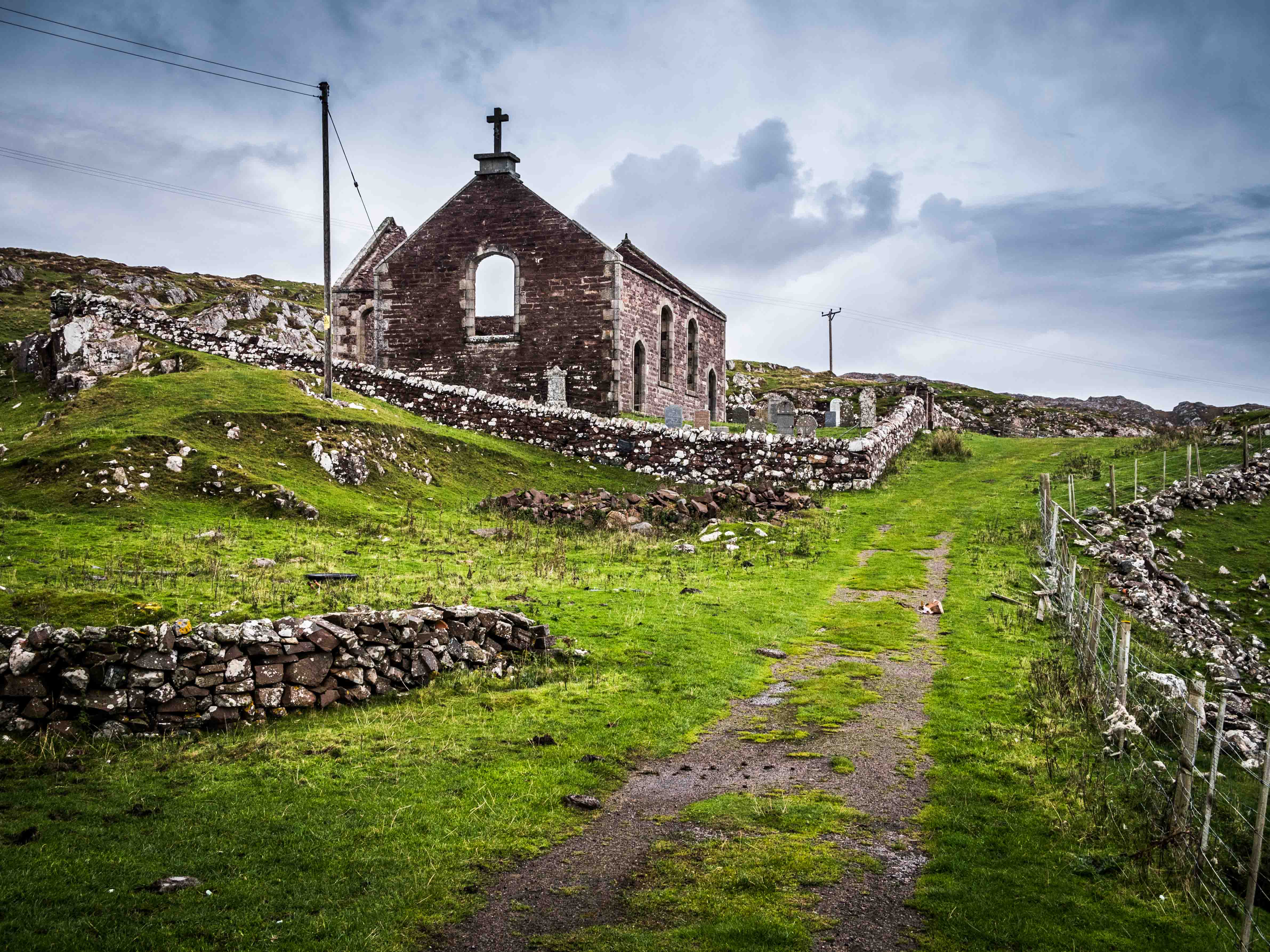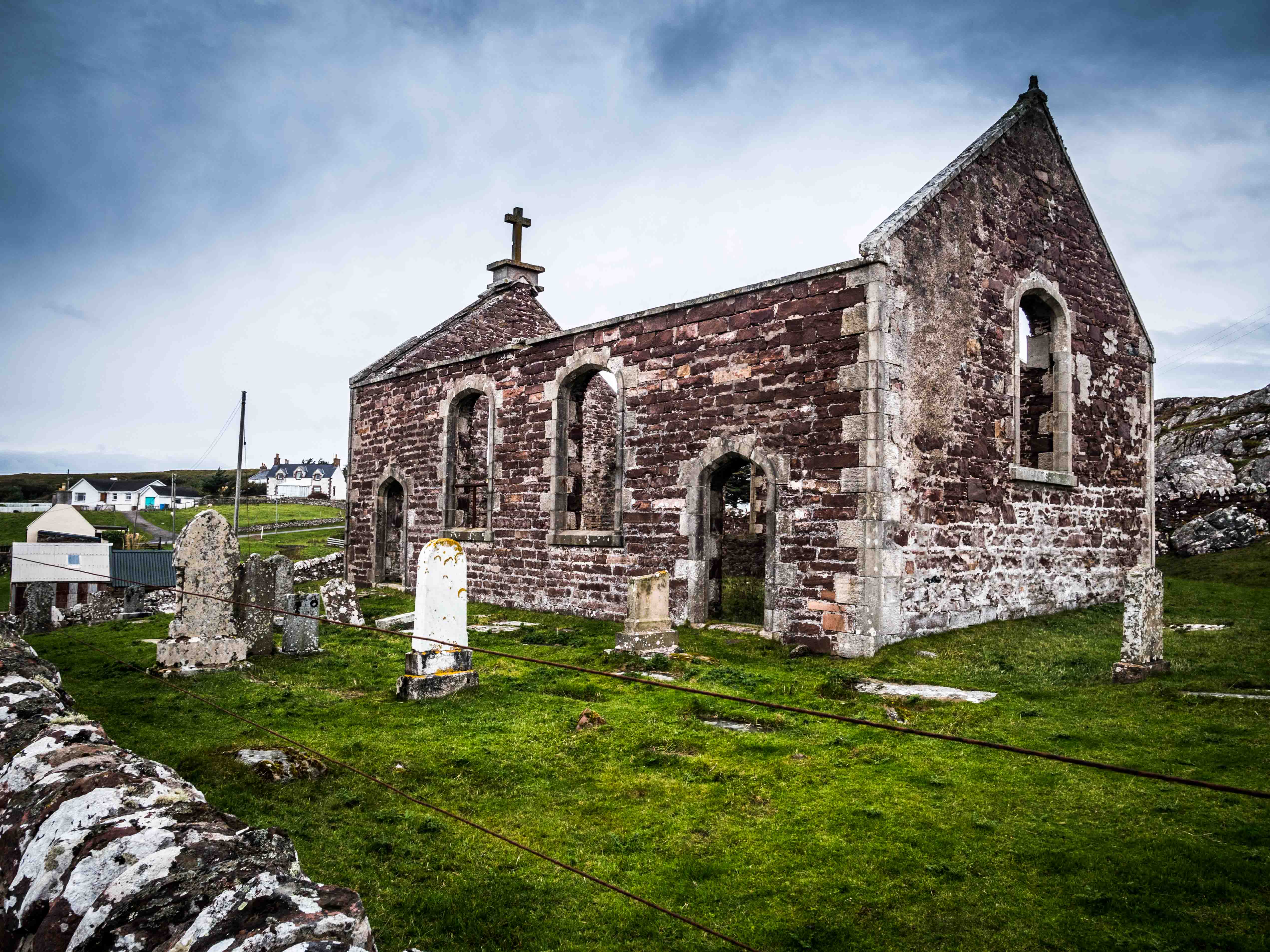 On our way to Stoer Point we spotted Stoer Church, an interesting old building, now left to ruin. Some online research showed that the current owners had wanted to turn it into a holiday home, but were not granted permission after many protests from locals. Around the church, many old graves stand and the feeling within the village was that it wouldn’t be right to develop this building into a marketable property. Bizarrely there are actually three graveyards in Stoer! The lighthouse at Stoer Point is now automatically controlled, and rather than let the surrounding buildings crumble away, some enterprising person now lets them out on a weekly basis! From here you can walk to the Old Man of Stoer, a 60′ sea stack – but again, the road called us onward, leaving this walk for a future trip.