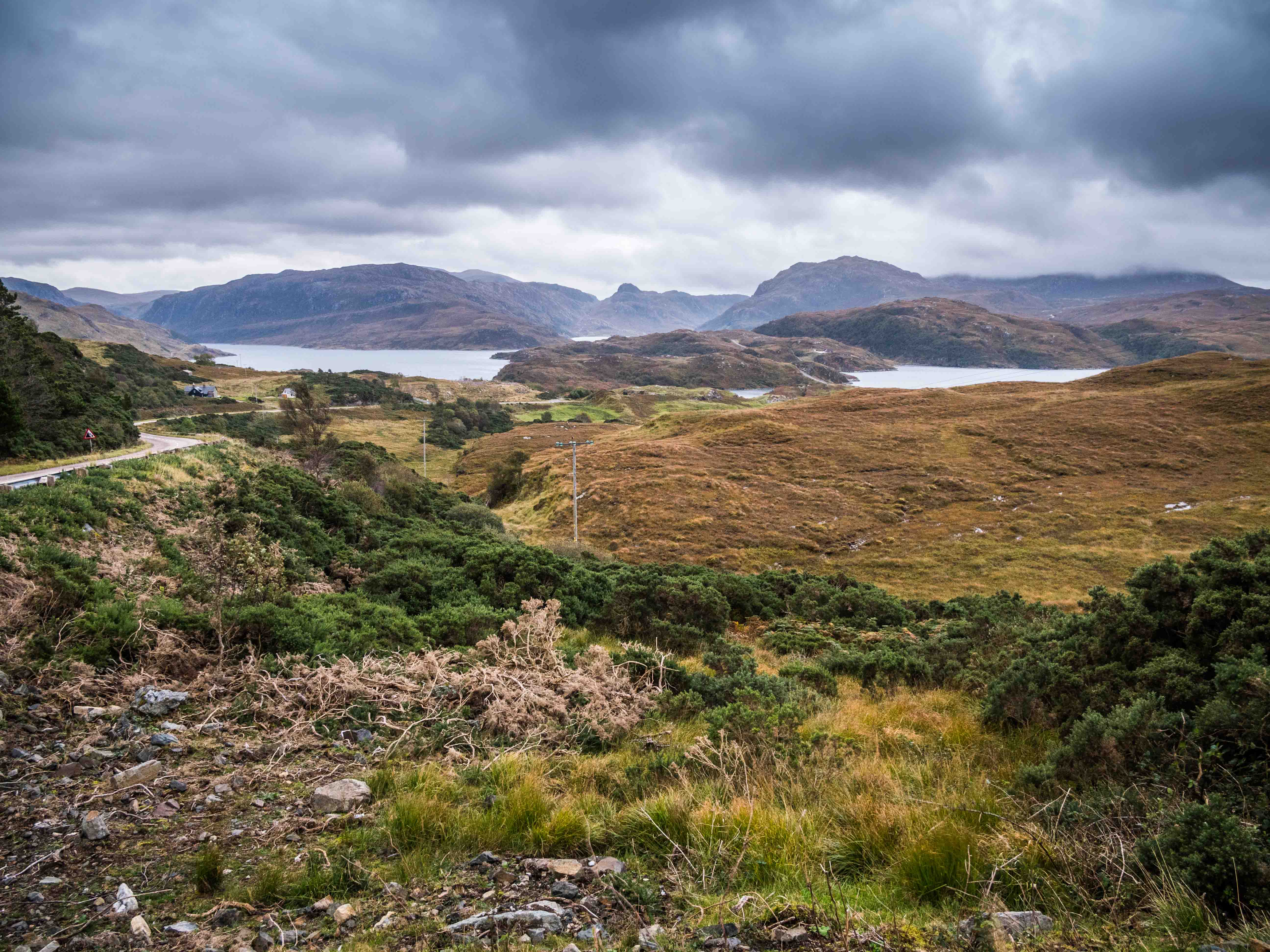 Today, although still windy, was finally dry with a few rain spells, which made a difference to the overall feel of the day. Our waterproofs didn’t become heavy with moisture and my hands and feet stayed mainly warm. We added in an extra loop, so we could ride the the road between Drumrunie and Lochinver, without missing any of the sights on the main stretch. Our first stop was Ullapool, where we chatted to John, an incredibly friendly man in the tourist information centre. After a good natter, which included swapping tales of travelling in New Zealand, we headed next door to the West Coast Deli for a second breakfast! We both tried their interesting take on sausage rolls eating a black pudding roll and a thai curry one! We also bought sandwiches here for lunch on the road.