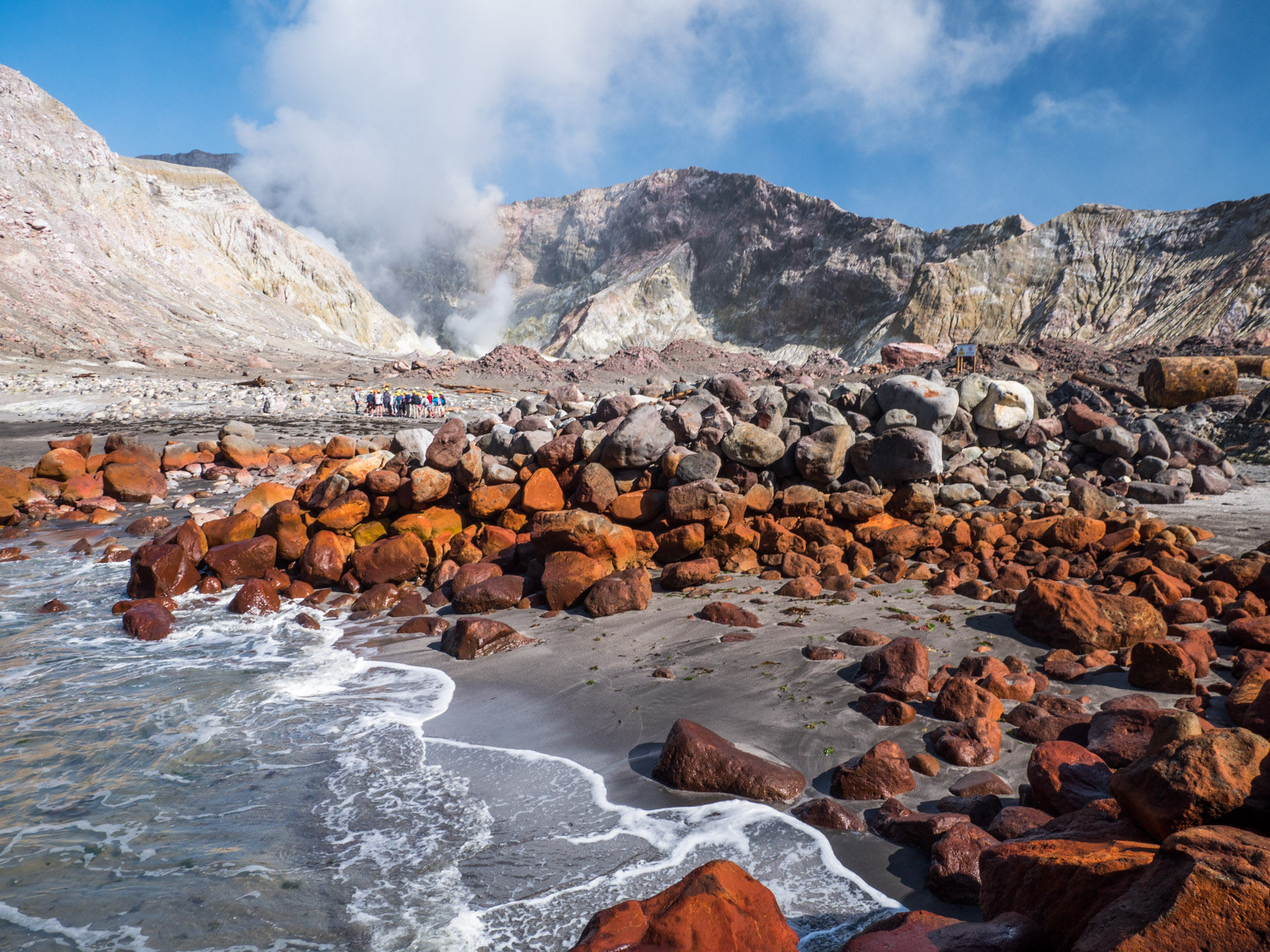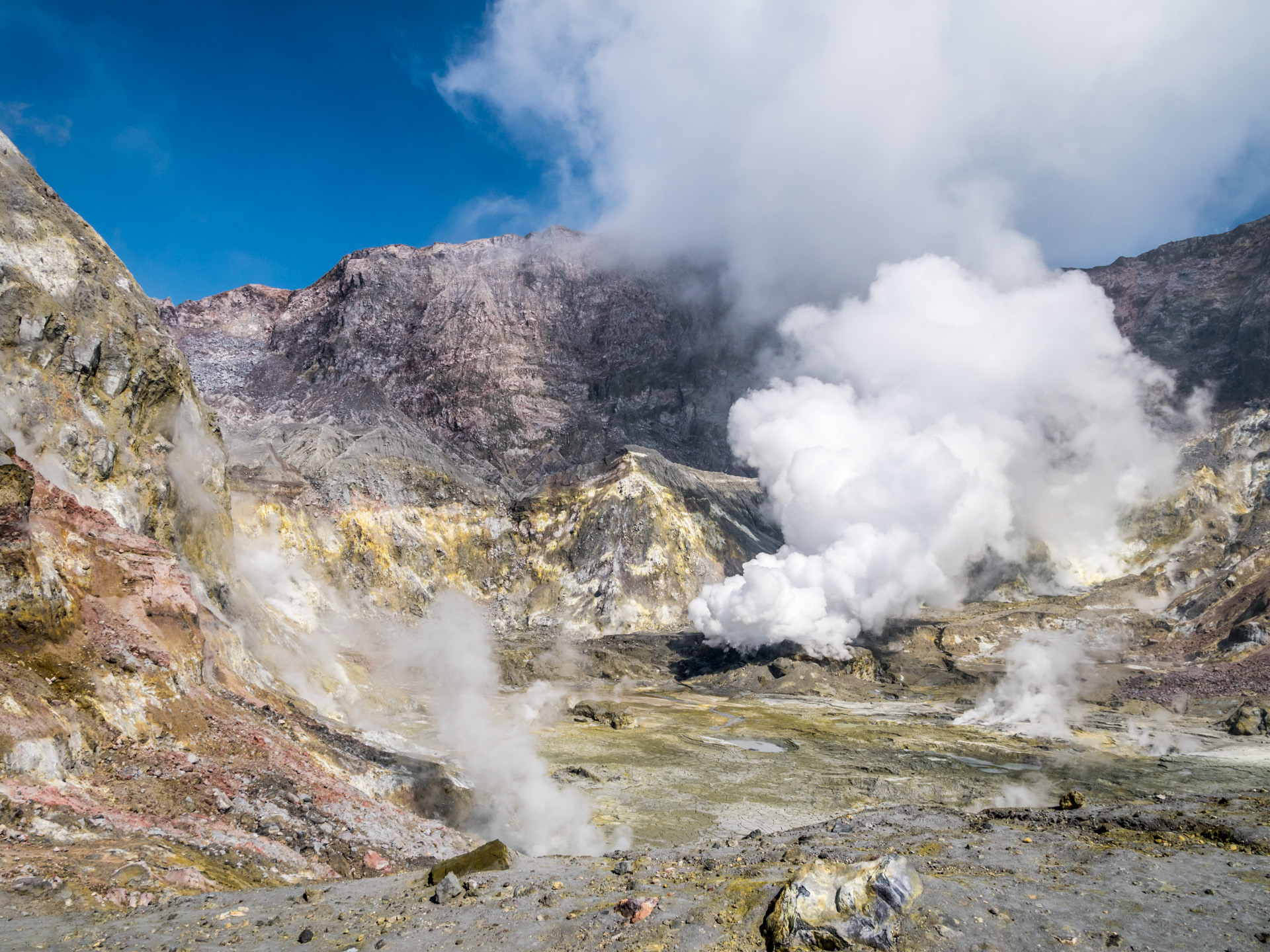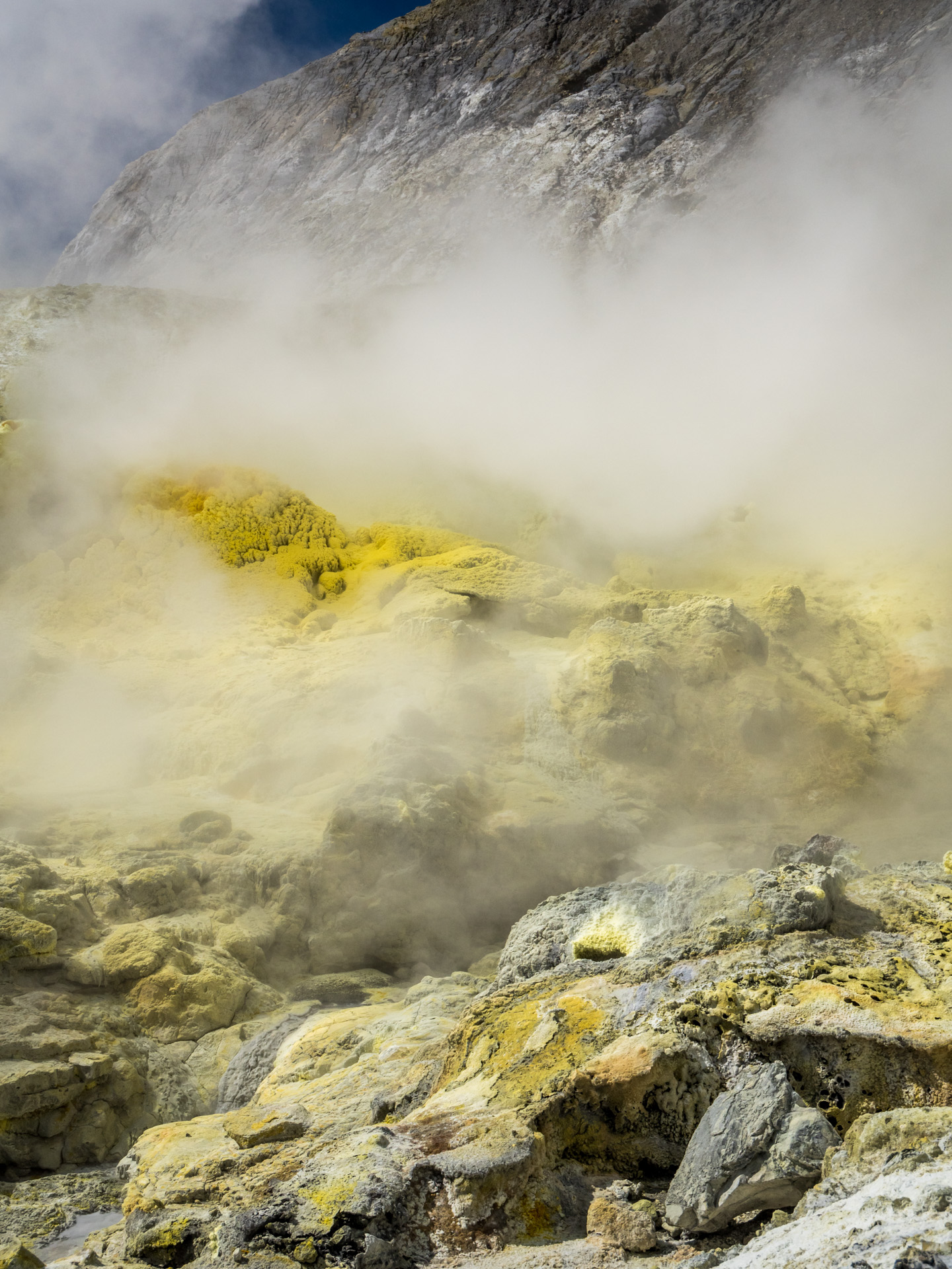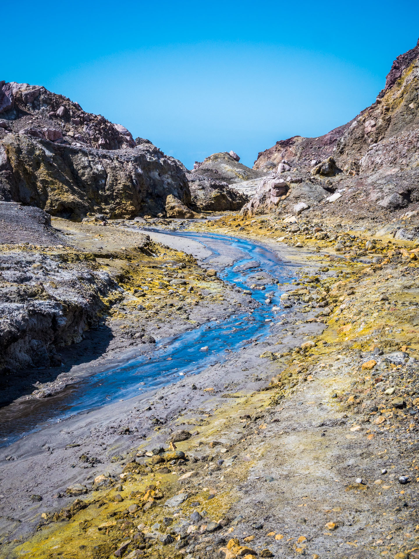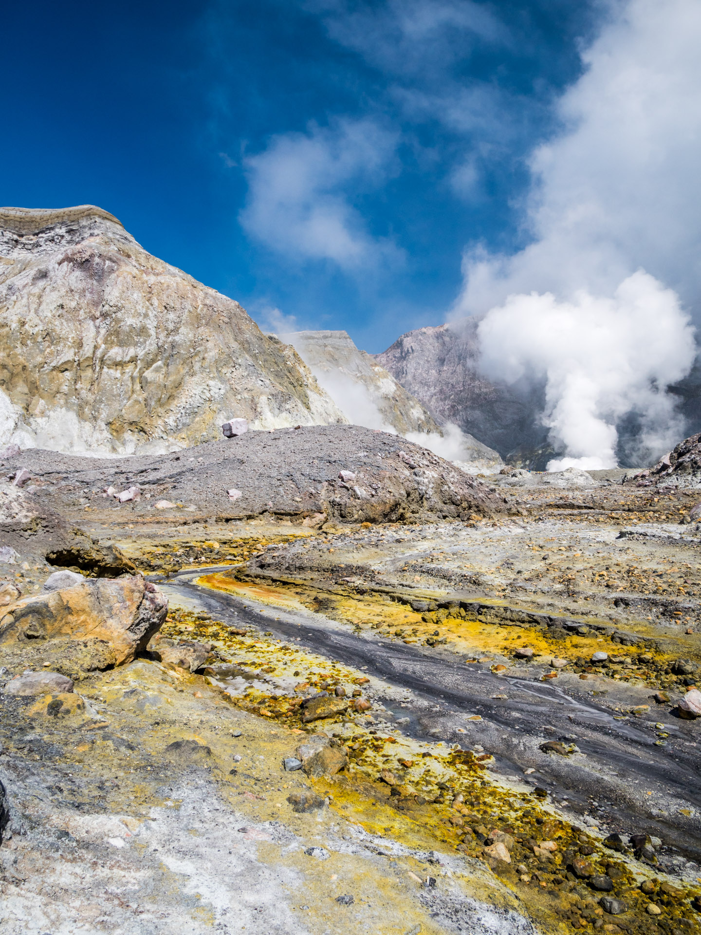 These days, the volcano is closely monitored for signs of activity, and tours do not run if there is any real danger. Despite this, as you leave the boat everyone is issued with a gas mask and helmet. White Island is New Zealand’s only active marine volcano, and it is indeed pretty lively! The ground is warm enough in places to feel the heat seeping through your shoes whilst pressurised steam pours out of vents in the ground and cliff face. Several mineral rich streams run through the island flowing out into the ocean and pools of bubbling mud can also be found. Almost nothing grows here, leaving the island barren, strewn with clumps of rock from previous eruptions. In this case though, barren is beautiful with hues of orange and yellow, caused by the high levels of sulphur on the island.